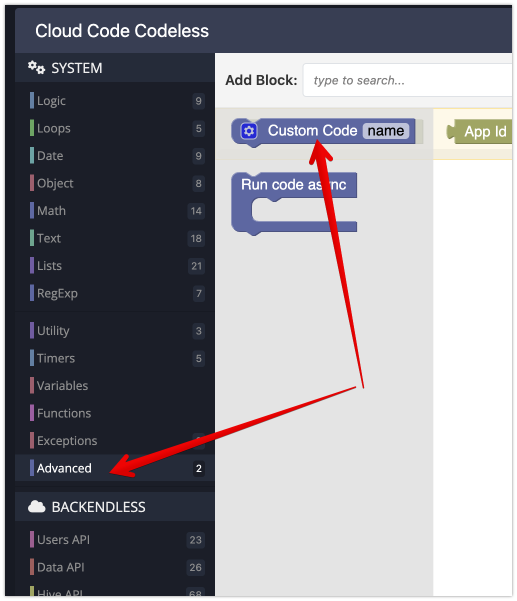 The block runs any arbitrary JS, can accept arguments from your Codeless logic and return a value.