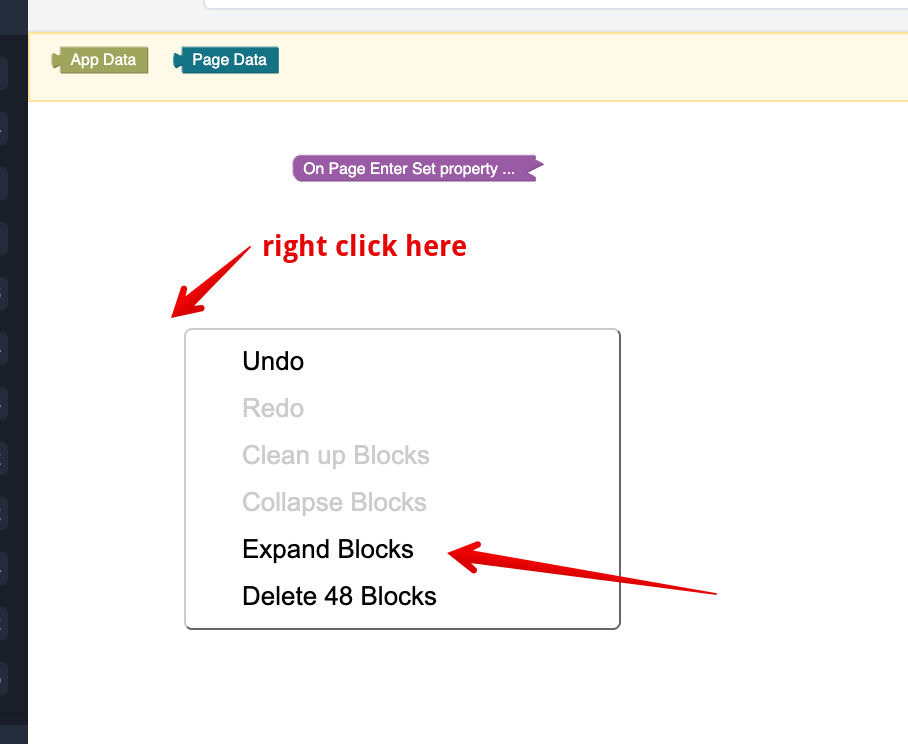 I opened ‘On Page Enter’ logic to edit the codeless blocks I’d put in previously. All that was visible was this block: