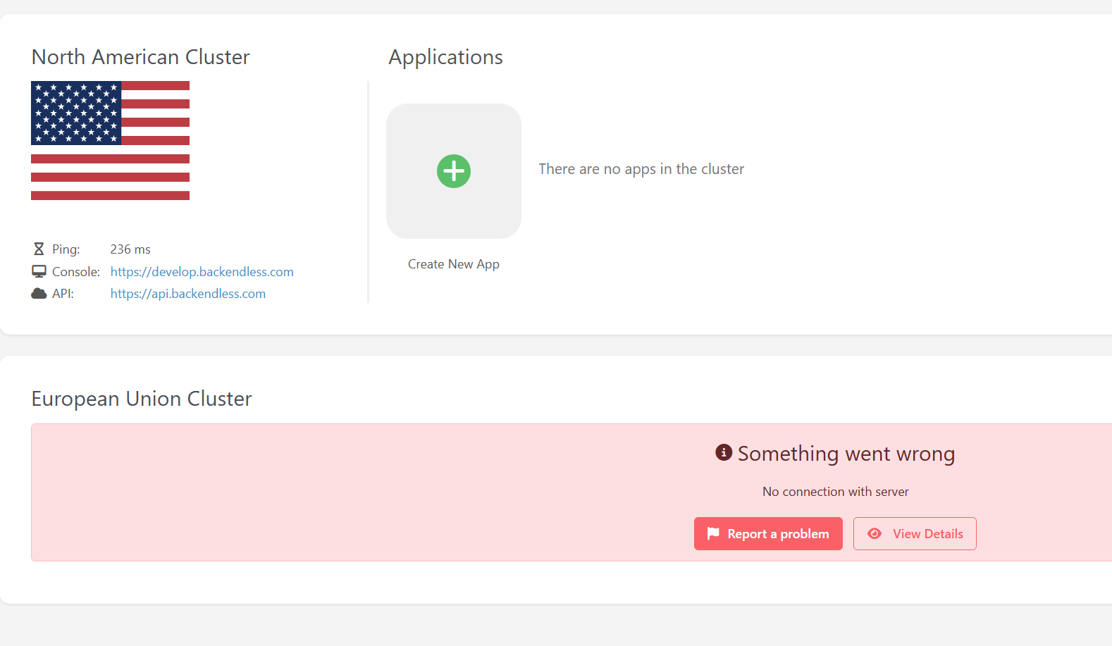 The front page of Backendless cannot connect to the European server where my apllication exists. So, it is impossible to work with the application now.