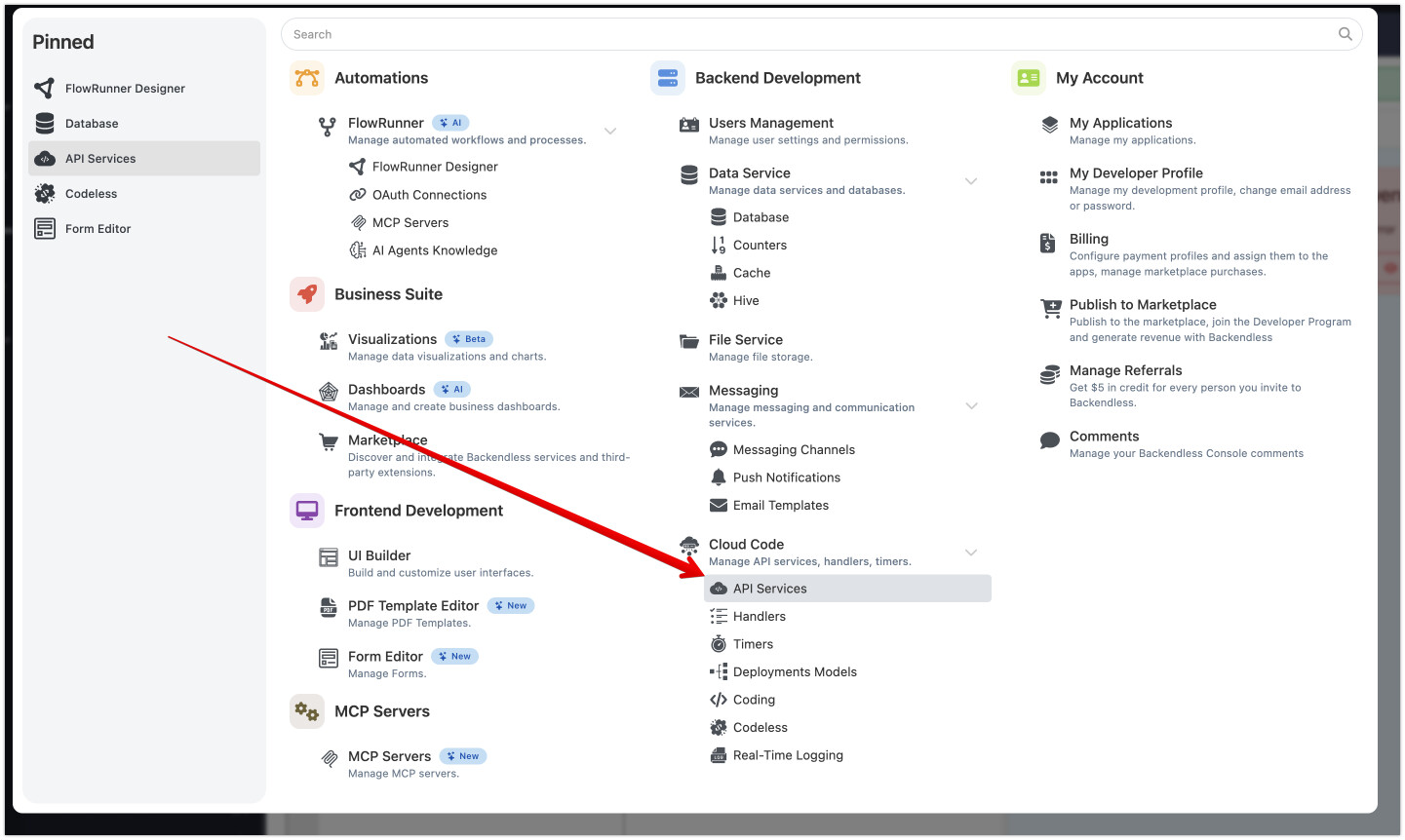 The Cloud Code screen is the same as API Services under QUICK ACCESS: