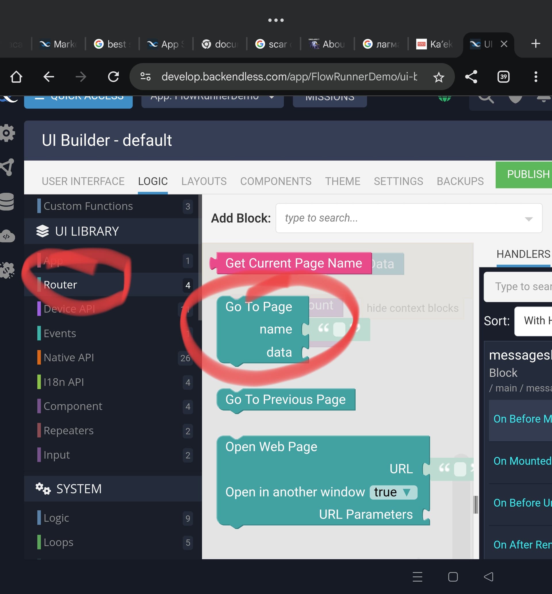 Where do I find the replacement code block for BackendlessUI.goToPage > BackendlessUI.Navigator.goToPage(name, data)?